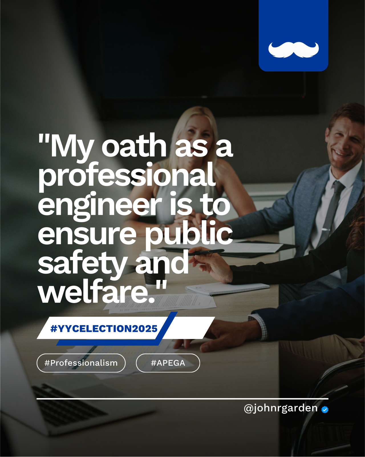 I’m John Garden, Ward 2 Councillor candidate for the 2025 Calgary Civic Election, and a professional engineer who takes my obligation seriously. Through my designation, I am bound by the Association of Professional Engineers and Geoscientists of Alberta’s (APEGA) oath and code of ethics. It is my pledge and personal guiding philosophy to ensure public safety and welfare while practicing integrity, honesty, and fairness.